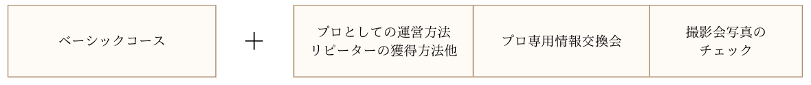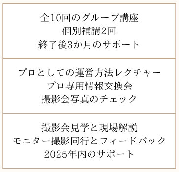 撮ってだしや構図、編集時のレタッチ、仕上げや世界観の表現としてのphotoshop、写真を撮るうえでのフォトグラファーとしてのスキルを一貫して学び、お客様に喜ばれて「是非また撮ってほしい」とリピーターになっていただけるスキルを学ぶ講座です。