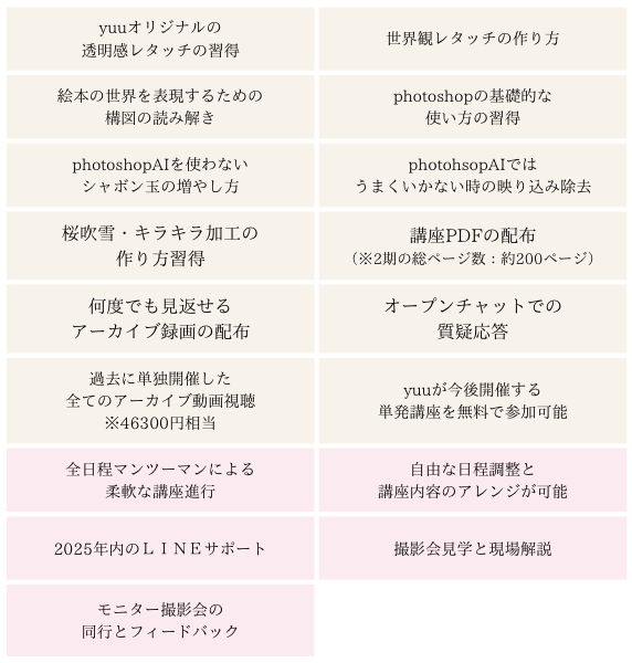 Yuuさんの写真に近づきたい方は、ぜひ受講して丁寧なお仕事に感動して欲しいです。