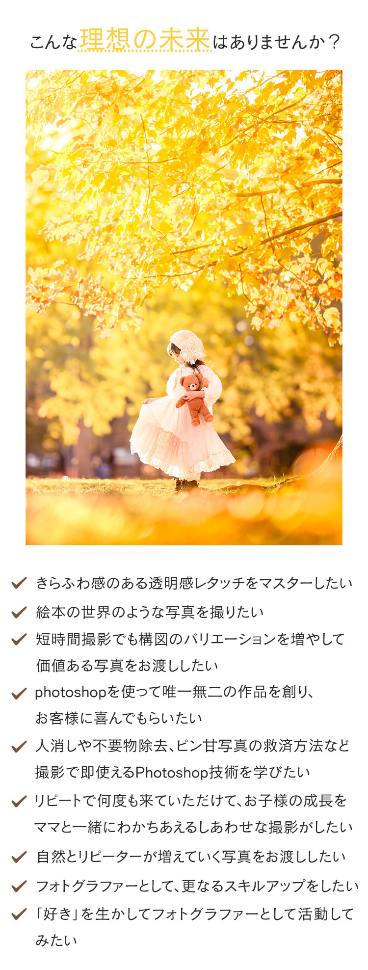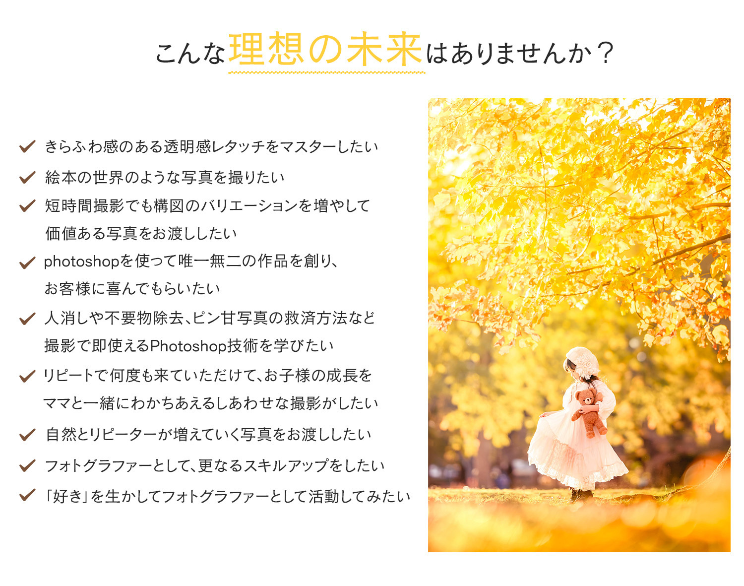 透明感レタッチを習得しPhotoshop技術で表現力を磨くことであなただけの唯一無二の世界観を表現できるようになり、プロの方は他のフォトグラファーと差別化され自然とお客様から選ばれるようになります。