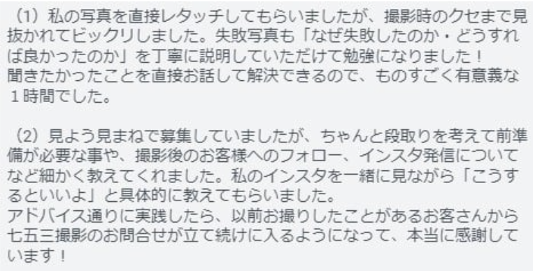 『ワンコイン撮影から卒業して胸を張ってお金をいただきたい、 絶対変わりたい!』という強い意志でご受講いただきました。