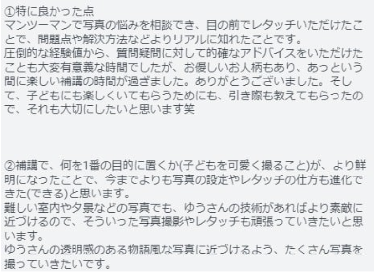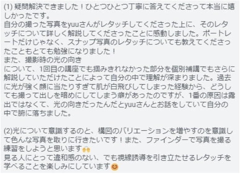 プレミアムコースは撮り方も丁寧に寄り添ってくださるので上達が早いですし、何よりYuuさんとの会話が毎回楽しかったです♡
