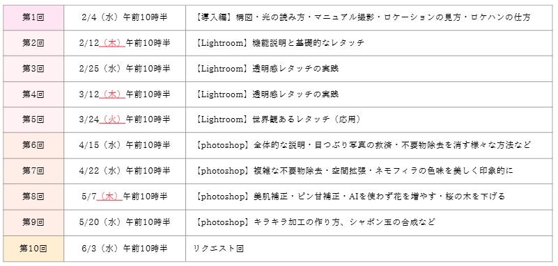 この講座は7月から計8カ月間、yuuの持つ全知識をお伝えしていきます。初心者さまもご参加されるので、マニュアルモードの設定方法、Lightroomのパラメータの知識など、1つずつお伝えしていき、最終的にはphosohopも扱えるようにカリキュラムを組んで、 過去の私が受けたかった内容に仕上げています。